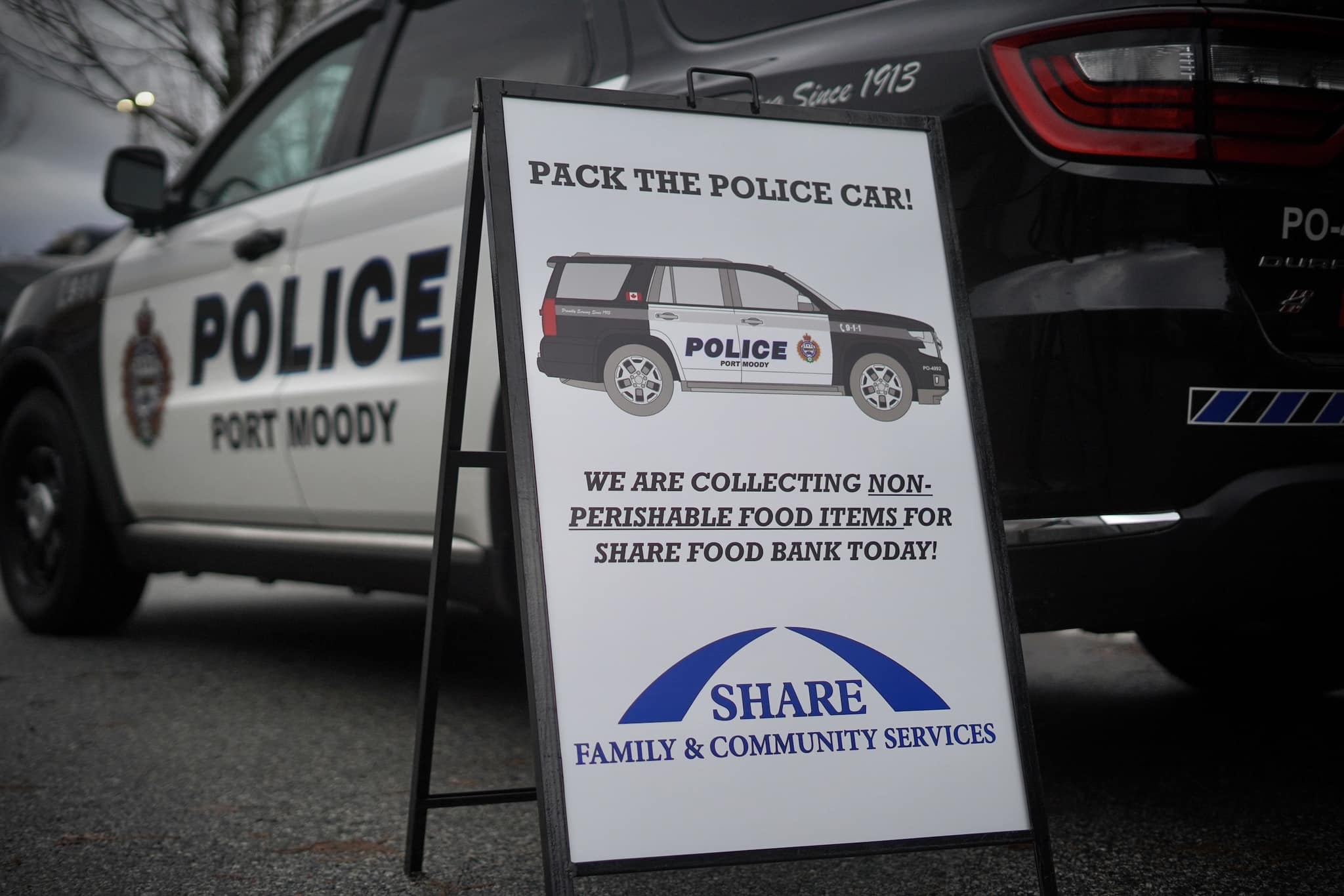 Coquitlam RCMP and SHARE Family and Community Services are hoping to pack a police cruiser with non-perishable food items, as well as grocery gift cards and cash donations.